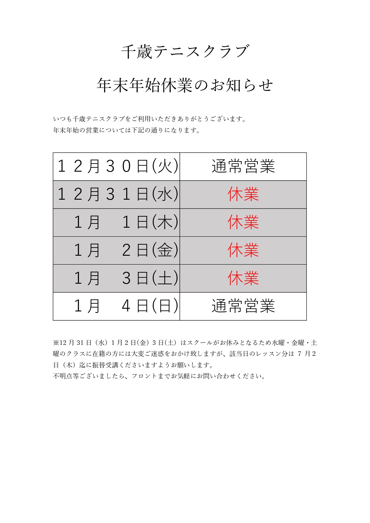 千歳テニスクラブでは、12月31日(水)~1月3日(土)のスクールをお休みとさせていただきます。